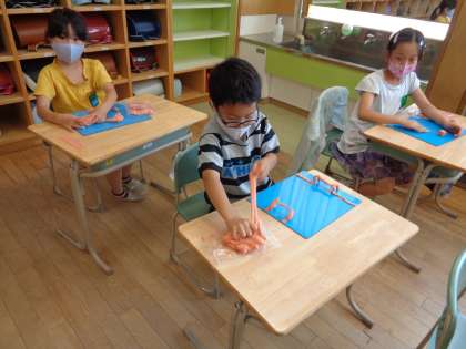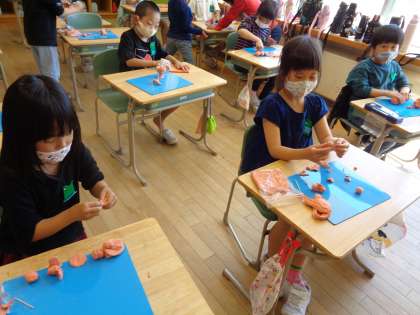 今日は、粘土を使って、思い出に残っていることを形に表しました。「お寿司を食べに行ったこと」「潮干狩りに行ったこと」「ランRUNオリンピックの玉入れ」等、それぞれ楽しかったことやがんばったことを思い出しながら作っていき、かわいらしい作品がたくさんでき上がりました。