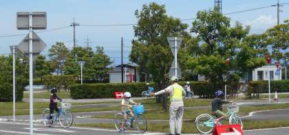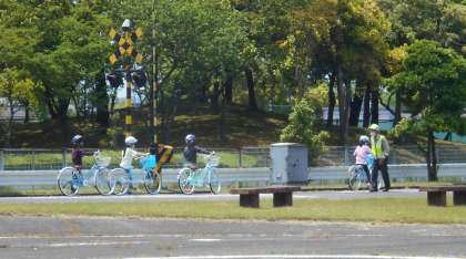 自転車での踏切や信号等の渡り方を教えていただきました。自転車に乗りながら左右を確認したり、一旦停止でしっかり止まったりと、安全な自転車の乗り方をしていました。