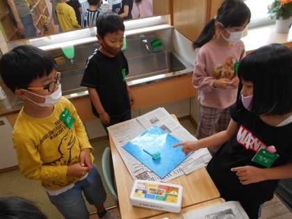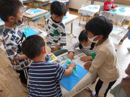 図画工作科「ねんどとなかよし」で、友達の作品のよいところを見付ける学習をしました。子供たちは「細かいところまで作ってあるね。」「本物みたいだね。」など、作品をよく見て、よいところを友達に伝え合っていました。