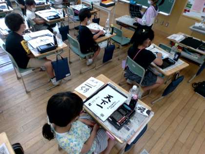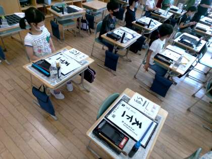 毛筆の学習に取り組む際の準備や後片付けについて、学びました。