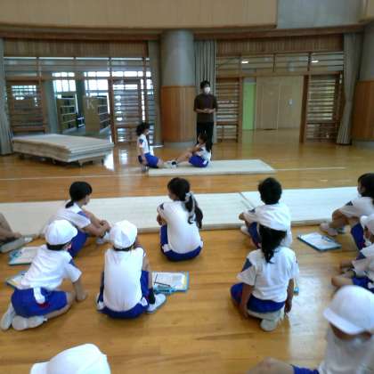 1年生のスポーツテストを手伝った6年生。「がんばれ!」など、温かく声をかける様子が見られ、とてもよい雰囲気でした。