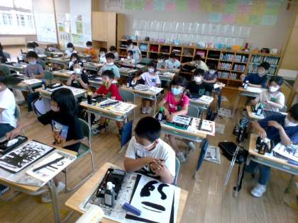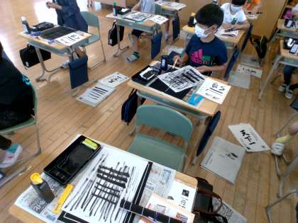 墨液と筆を使って、線を書きました。子どもたちは、筆の持ち方を意識しながら書いていました。