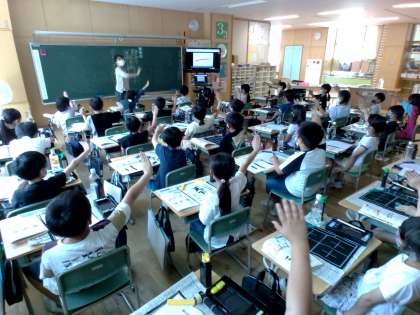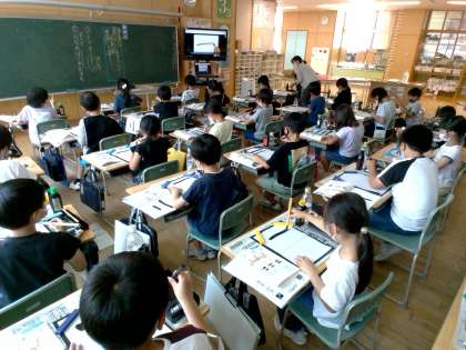 習字セットを使って毛筆に挑戦しました。筆を立てて書くことに難しさを感じながらも横画を熱心に練習していました。