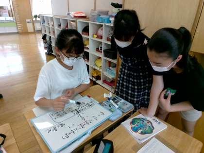 算数科の学習で、分数のわり算の仕方を考えています。友達とグループになって学習することで、考えを深めています。