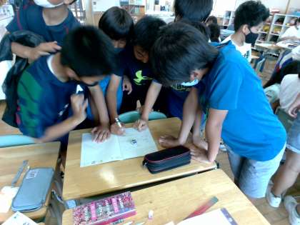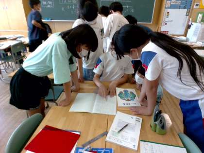 算数科の学習で、分数のわり算の仕方を考えています。友達とグループになって学習することで、考えを深めています。