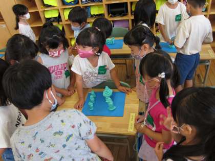 図画工作科「ひもひもねんど」で、友達の作品のよいところを見付けて、友達に伝え合う学習をしました。