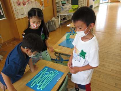 子供たちは、「長いひもを使って、みんなに何の作品か分かるように作っていて、よいと思いました。」「細かいところまで丁寧に作っていて、よいと思いました。」など、いろいろなよさを見付け、伝えることができました。