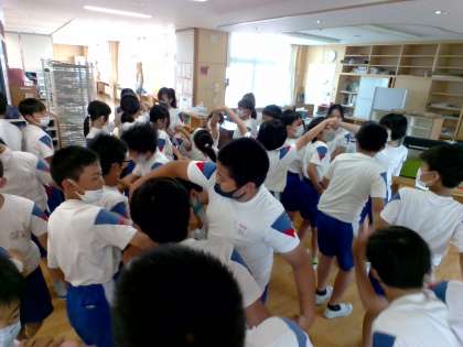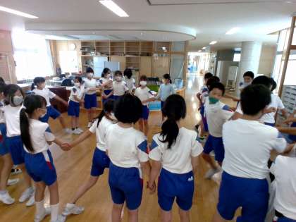 3組では、遊び係が企画した「人間知恵の輪」を行いました。クラス全員でのチャレンジでは、輪が途中でちぎれたり声が届かず意思疎通が難しかったりと、楽しみながら困難に立ち向かう様子が見られました。