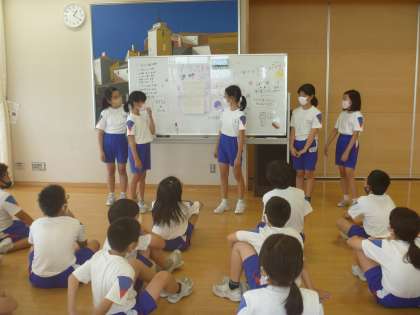 イラスト係が企画した集会に参加し、楽しく過ごしました。ランチルームに隠された「たまご」を探しました。