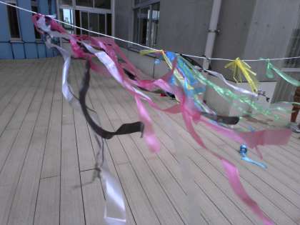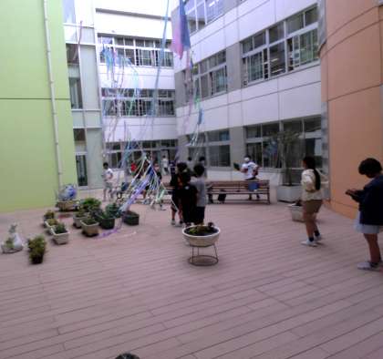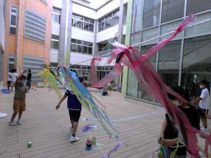 図画工作科で、造形あそびをしました。豊田小学校の自慢である光庭を「風を感じられる場所」につくり変えることを楽しみました。