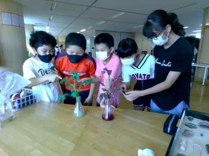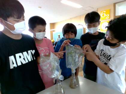 理科「植物のからだのはたらき」では、蒸散や根から水を吸い上げる様子を観察しながら、学習を進めています。