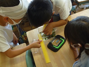 育てているメダカが大きくなってきました。休み時間にものさしを使ってどのくらい大きくなったか、調べている子供たちがいました。大きなメダカで、1センチメートルくらいでした。これからも大切に育てていきましょうね。
