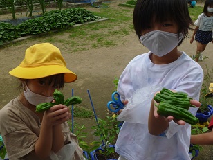 育てている野菜が実ってきました。子供たちは、毎日実の大きさや色を確認して、「まだかなあ」と収穫を楽しみにしている様子です。今日は、ピーマンを収穫することができました。