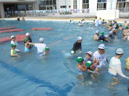 6年生のお兄さん、お姉さんにプールの使い方を教わったり、一緒に歩いたりしました。