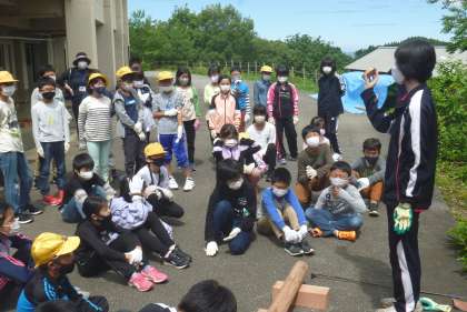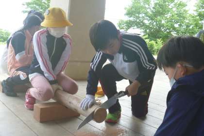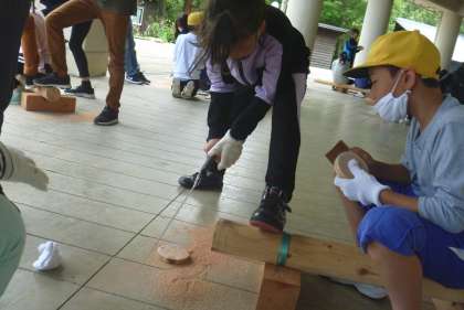 丸太をのこぎりで切り出し、コースターを作りました。切り出したコースターをやすりで磨き、焼き印を押して仕上げました。のこぎりで切る人、丸太を押さえる人と役割を分けて、協力して活動することができました。