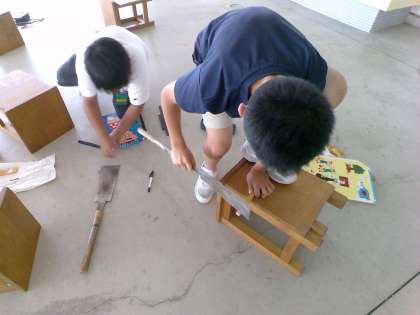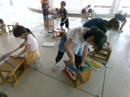 4年生は、のこぎりを使ってコリントゲームの台になる板を自分の好きな形に切っていました。ピロティーに椅子を出し、板をのせる向きやのこぎりの角度に気を付けて、真剣に切り出していました。