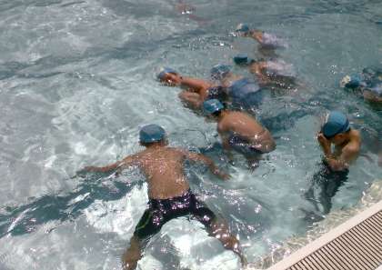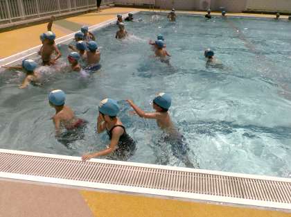 2年生は水泳学習を行っていました。水に顔を付けたり、いろいろな浮き方に挑戦したりしていました。