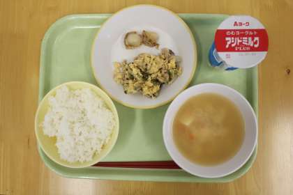 今日の献立は、ご飯、ゴーヤの卵炒め、ほたての香味焼き、白玉汁、のむヨーグルトです。