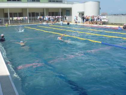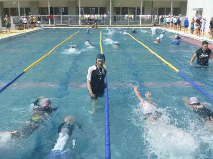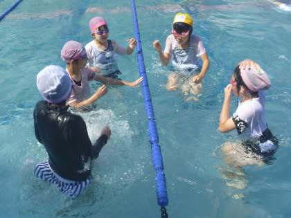 自由時間には友達と水中ジャンケンや鬼ごっこをして楽しみました。サンサンと輝く太陽の光を受けながら、気持ちよく学習を行いました。