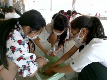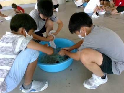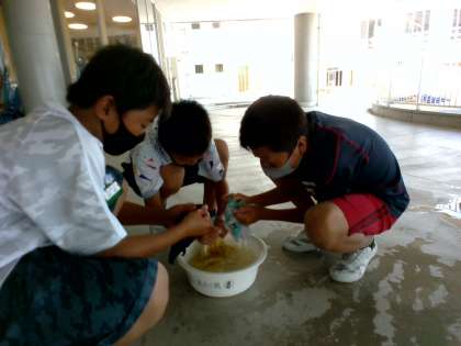 家庭科の学習で洗濯実習を行いました。手でもみ洗い、つまみ洗いなどを行うことで汚れが落ちていくことに喜んでいる子どもたちの姿が見られました。