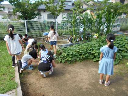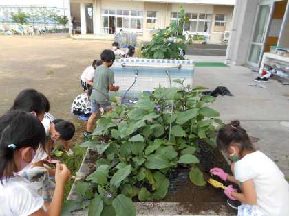 朝活動の時間にプレイグラウンドに出て草むしりを行いました。生活科で育てている野菜の畑の周りを中心に行い、ゴミ袋いっぱいに草を抜くことができました。