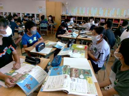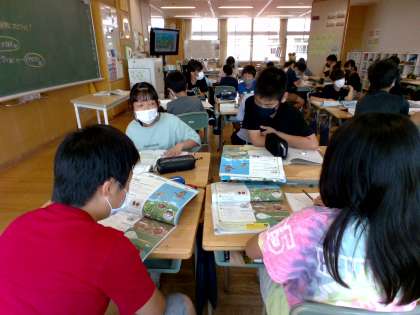 理科の学習では、食物連鎖について学びました。教科書の図を見ながら、生き物の「食べる・食べられる」といった連鎖の関係について、話し合ったり確かめ合ったりしました。