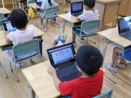Chromebookを使って、足し算や引き算の練習をしました。答えを入力し、10問連続正解すると大喜びで、何度も繰り返して挑戦していました。