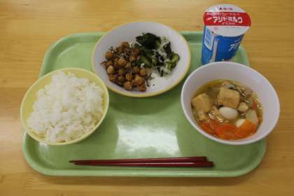 今日は、1学期最後の給食となりました。献立は、ご飯、厚揚げの中華煮込み、小魚入りフライビーンズ、酢の物、のむヨーグルトでした。