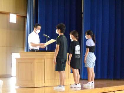 終業式後、第1回受賞紹介式がありました。水泳や陸上で受賞した児童が紹介されました。