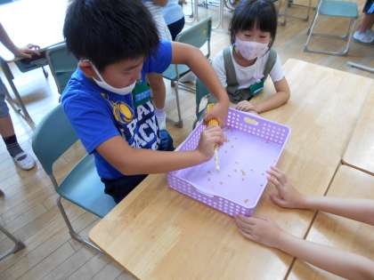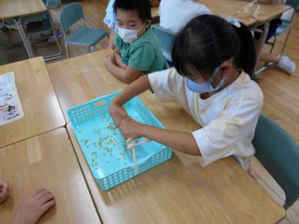 1組では今日、ポップコーンの実を取りました。「ぞうきんをしぼるようにすると、上手に取れるよ」という先生のアドバイスを聞き、子供たちは力一杯に実を取りました。中には頑張りすぎて手が真っ赤になってしまう人も。取った実を使ってポップコーンパーティーをする予定です。楽しいパーティーになるように、準備を進めていきたいと思います。