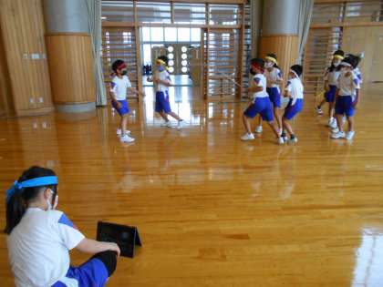 3年生は、体育でグループ毎に長縄の8の字ジャンプに取り組み、クロムブックで跳んでいる様子を動画で撮影しました。授業終了後には、「動画を見て作戦を考えよう」「どんな風に跳べばよいか話し合おう」と声をかけ合っていました。