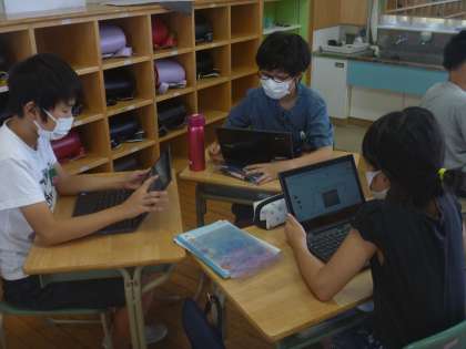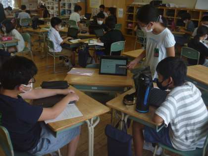算数科では、三角形の3つの角の和が180度であることを使って、四角形の4つの角の和を求めました。自分の考えを友達に伝え合い、様々な考えがあることが分かりました。