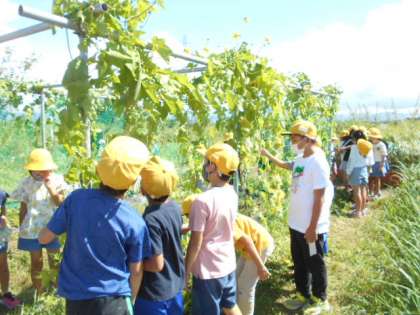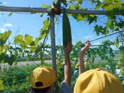 夏休み前と比較しながら、ヘチマの観察をしました。雄花と雌花があることを知り、どのように実が育っているかを確かめた4年生でした。