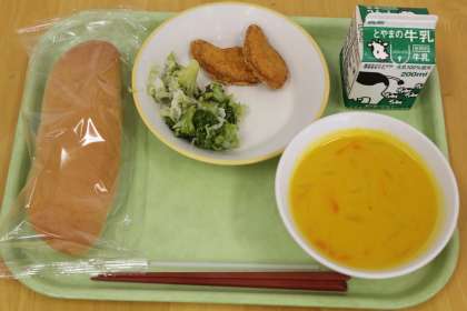 今日の献立は、コッペパン、チキンナゲット、フレンチサラダ、かぼちゃポタージュ、牛乳です。