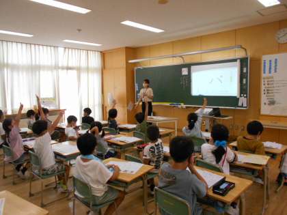 1年生の教室ではカタカナの学習をしていました。「パ」の付く言葉を見付けて元気よく手を挙げて発表していました。