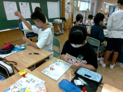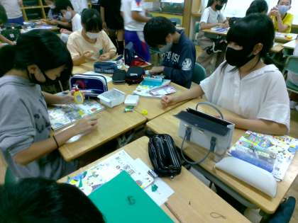 裁縫の学習をしている様子です。友達と教え合いながら作業を進めていました。