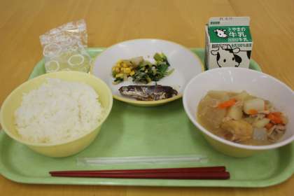 今日の献立は、ご飯、いわしの生姜味、コーン和え、大根のみそ煮込み、冷凍パイン、牛乳です。