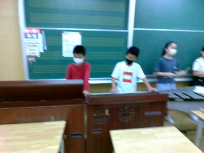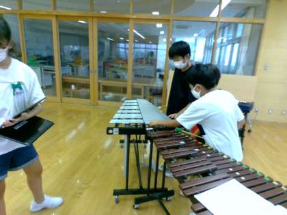 音楽科の学習では、木琴や鉄琴を使った合奏に取り組んでいます。感染症対策に留意し、学習を進めています。