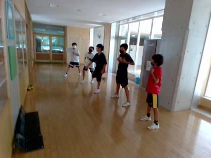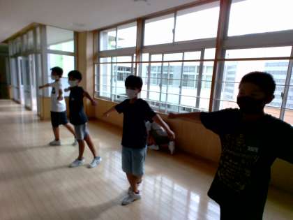 体育科の学習で、リズムダンスに挑戦しています。基本の動きを使って構成し、音楽に合った動きを楽しんでいます。時間を見付けて積極的に練習する姿も見られ、意欲的に取り組んでいます。