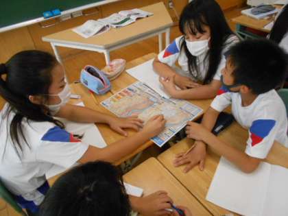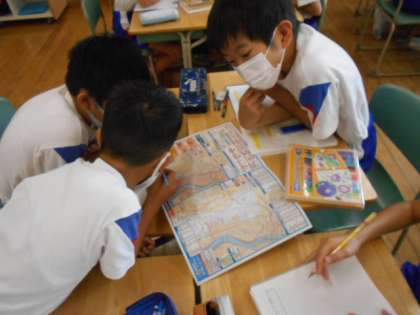 社会科では、自然災害について学習をしています。今日は、豊田校区のハザードマップを実際に見て、避難場所や自分の家の被害状況を確認した4年生です。