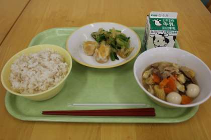 今日の献立は、麦ご飯、にんじんシューマイ、小松菜ひたし、八宝菜、牛乳です。
