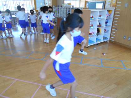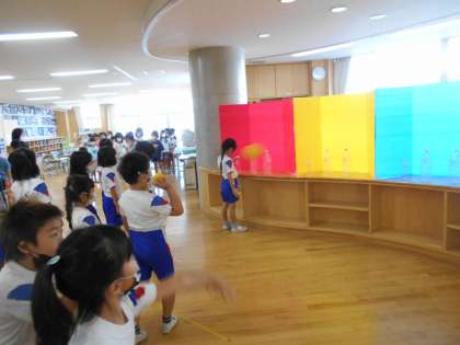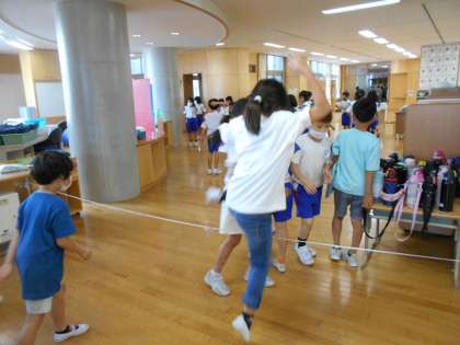 2時間目が終わると、2年生は学級ごとに走・跳・投の10分間運動として、ラダー走、ゴム跳び、ペットボトル倒しに取り組んでいました。ペットボトル倒しでは、倒したペットボトルの点数の合計を競い合っていました。