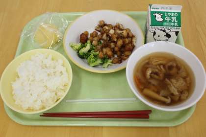 今日の献立は、ご飯、魚とひよこ豆の甘からめ、ゆでブロッコリー、すまし汁、冷凍りんご、牛乳です。