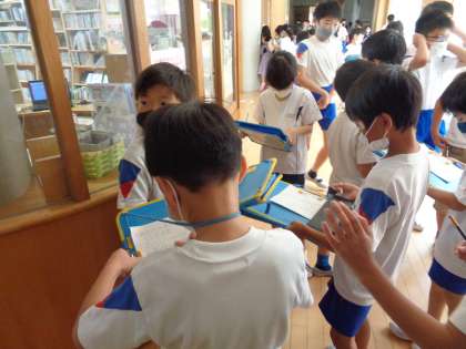 情報掲示委員会のビンゴ大会に参加しました。掲示物を友達と一緒に探す姿が見られました。委員会の上級生からサインをもらい、とてもうれしそうでした。