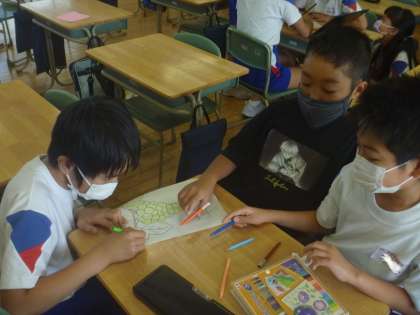 お題のイラストに決めた4色の色鉛筆を使って丁寧に塗りました。