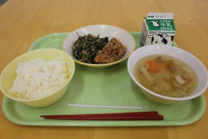 今日の献立は、ご飯、豚肉の香り揚げ、よごし、つみれ汁、牛乳です。
