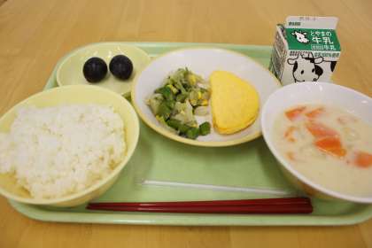 今日の献立は、ご飯、オムレツ、アスパラサラダ、白いんげん豆のシチュー、巨峰、牛乳です。