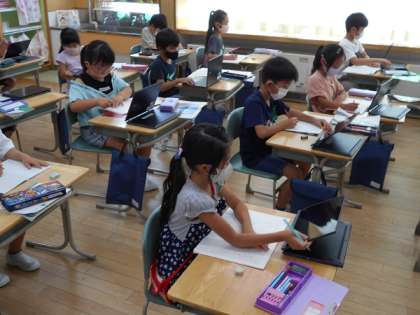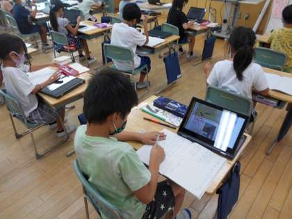 国語科で、「うみのかくれんぼ」の学習をしています。Chromebookの写真の中から、家の人に教えたい生き物を選び、隠れている場所や隠れ方をノートに書きました。