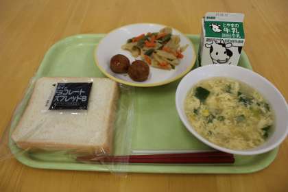 今日の献立は、食パン、ミートボールの照焼き、れんこんソテー、卵クリームコーンスープ、チョコレートクリーム、牛乳です。