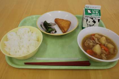 今日の献立は、ご飯、肉じゃが、はんぺんフライ、ゆかり和え、牛乳です。